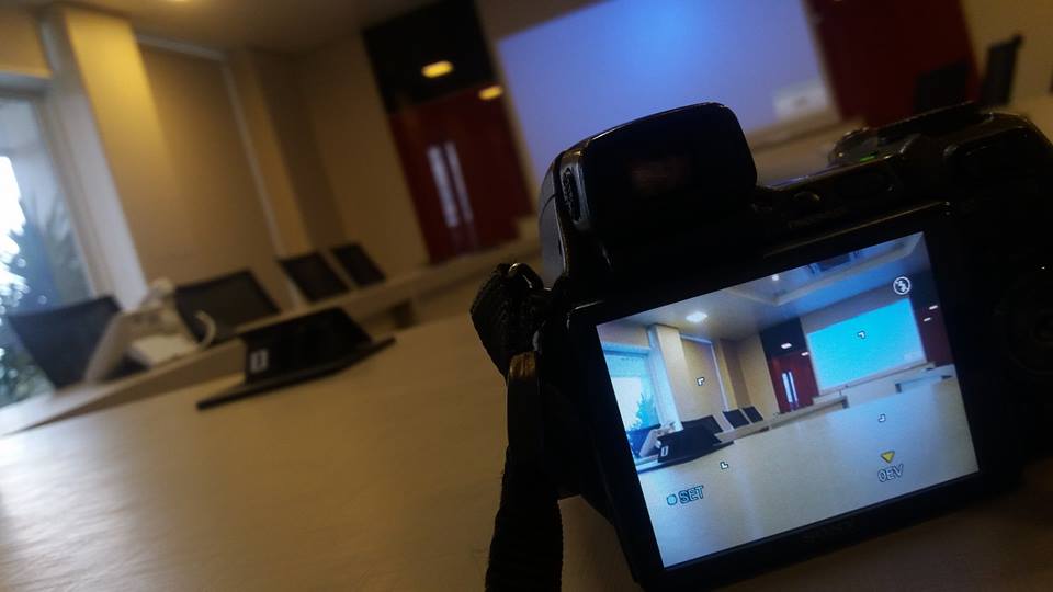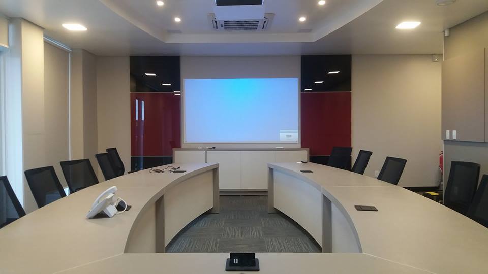 Sala de reuniões na empresa Casaredo, em São Lourenço do Oeste, Lift para projetor e painel de mesa com conexões HDMI, 220V e Rede Cat5. Som ambiente na empresa.